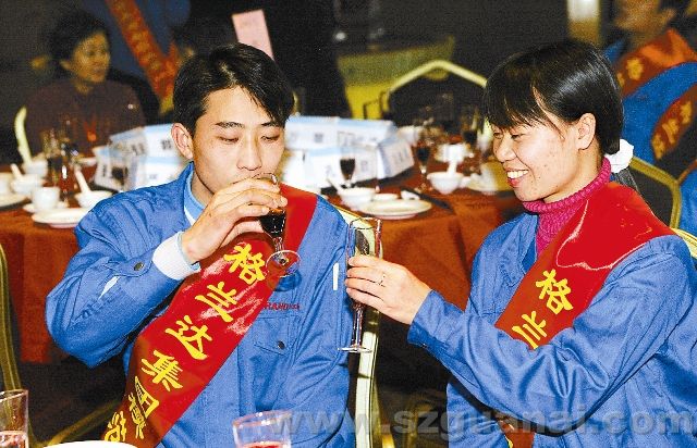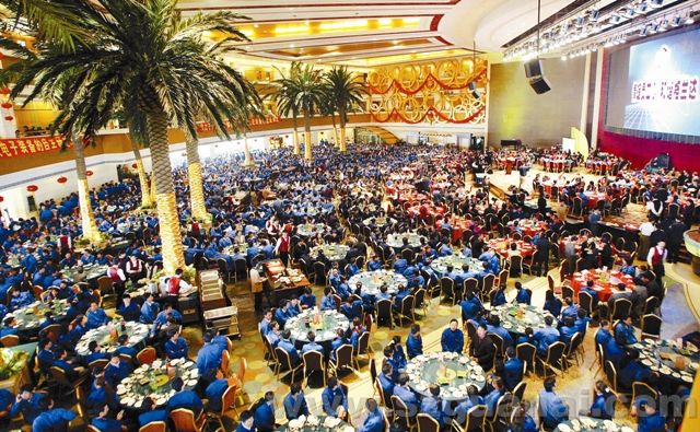 2007年2月3日中午時分,格蘭達2000多名勞務(wù)工走進五星級酒店與10多位全國政協(xié)委員同吃一道菜同唱一首歌。圖為2000多名勞務(wù)工享受著團圓飯。 ( 岑志利攝)