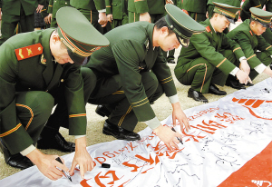 邊防官兵踴躍簽名獻愛心。 本報記者 許業周 攝 |