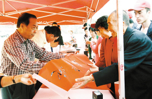 書法家為市民送春聯獻愛心。 本報記者 陳富 攝