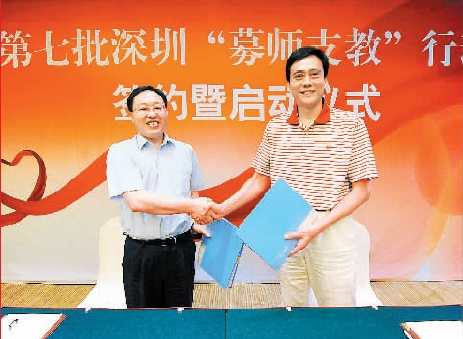 “募師支教”行動贊助方、深圳中航集團股份有限公司董事長吳光權與市關愛辦主任、深圳報業集團黨組書記、社長黃揚略簽署合作協議書后熱烈握手。廖萬育 攝