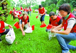 昨日,市義工聯環保組的近200名義工來到蓮花山,開展以環保為主題的環保嘉年華活動。義工們還在蓮花山進行了拾垃圾行動,讓市民在蓮花山過上一個清潔的國慶節。本報記者余海波 攝