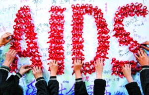 11月30日,安徽省含山縣第二中學(xué)學(xué)生用數(shù)百個紅絲帶拼成字母“AIDS”。在12月1日“世界艾滋病日”來臨前夕,安徽省含山縣第二中學(xué)開展“愛與生命同在”為主題的預(yù)防艾滋病、關(guān)愛艾滋病感染者的宣傳教育活動。新華社發(fā)