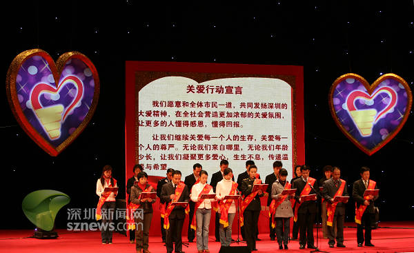 ?? 深圳關愛網訊(記者施翔東 張玲 羅秋近)新年剛過,一股關愛的春風就吹進了深圳這片溫暖的土地。2010年1月12日上午,第七屆深圳關愛行動在深圳市民中心禮堂隆重啟動,以“關愛?感恩?回報”為主題的各種關愛行動隨即在全市八區熱烈而隆重地展開。