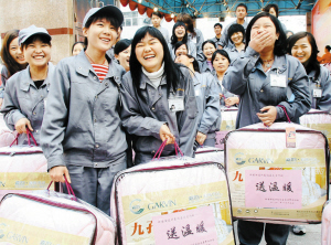 寶安區新安街道某工業區的青工們昨日欣喜地收到街道辦送來的關愛棉被。 深圳特區報記者 邱海彬 攝