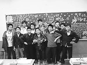 2009年9月10日,陳堅(jiān)培在大山深處度過(guò)了一個(gè)特別的教師節(jié)。圖為慶祝教師節(jié)聯(lián)歡晚會(huì)上,陳堅(jiān)培(后排居中者)與八年級(jí)的學(xué)生們合影。
