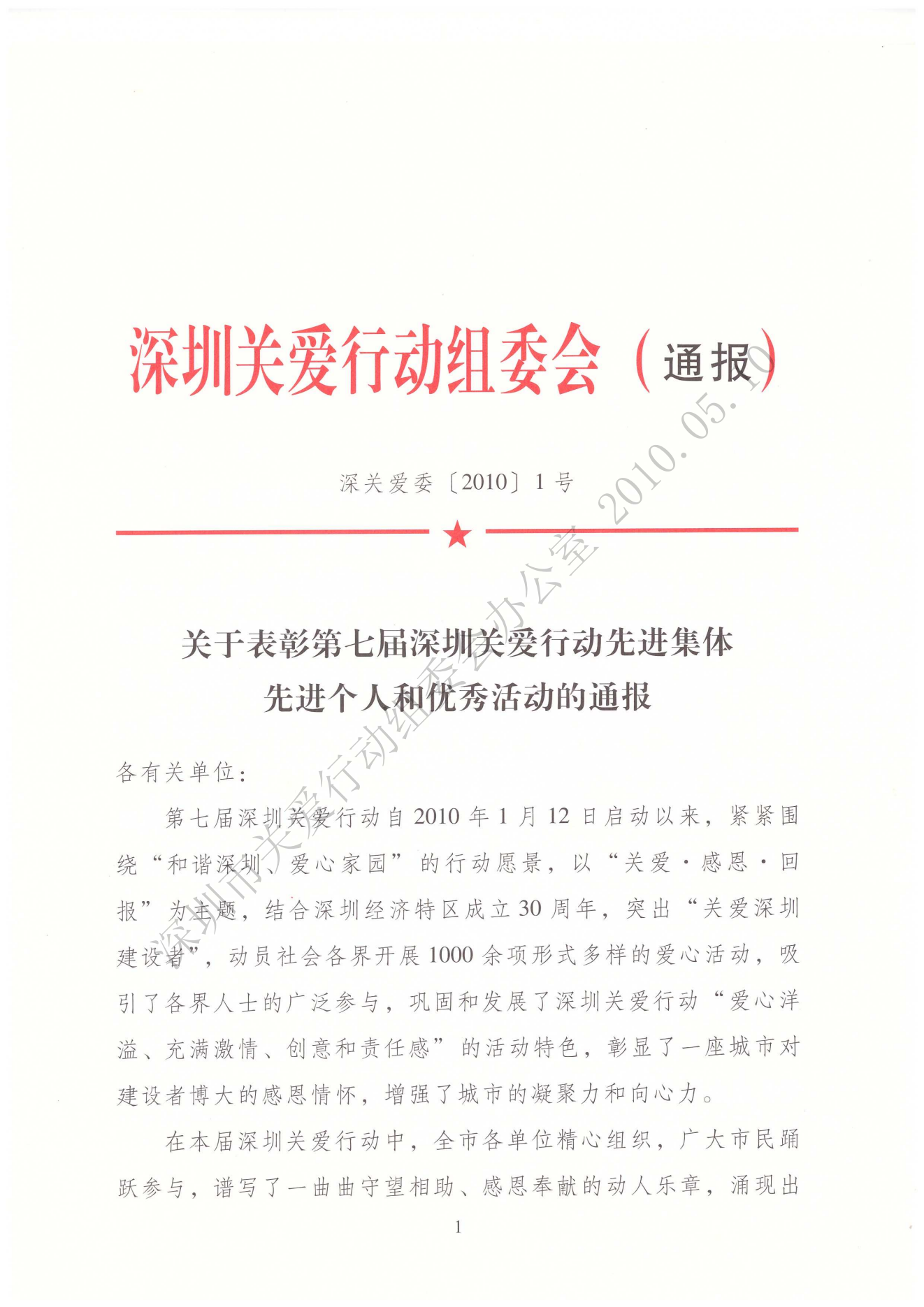 關于表彰第七屆深圳關愛行動先進集體、先進個人和優秀活動的通報
