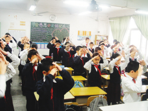 鹽田區(qū)鹽港小學(xué)同學(xué)們?cè)诰毩?xí)感恩手語操。