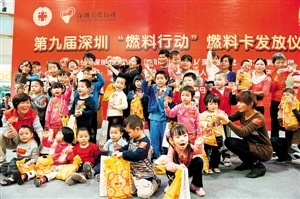 ????昨天,深圳益田假日中庭廣場傳出孩子們的陣陣歡笑聲,由市關愛辦、市紅十字會、深圳晚報、富士康科技集團主辦,麥當勞餐廳(深圳)有限公司、深圳市血液中心、深圳市第二人民醫院、香蜜湖獅子會協辦的第九屆燃料行動“燃料卡”發放儀式在這里舉行。41名地貧兒歡天喜地領到凝結著富士康科技集團和社會各界愛心的“燃料卡”。這些“燃料卡”將為特困地貧兒提供12次免費輸血,在新的一年里幫助地貧兒延續生命。市文明辦副主任穆同倫表示,關愛地貧兒童的燃料行動已成為深圳關愛行動的一大愛心品牌,它將社會各界的愛心匯成生命的燃料,讓深圳的地貧兒沐浴著陽光,健康地成長。