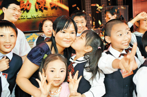 地貧兒親吻“花姐姐”。2005年,24歲的陳錦花將2歲的“地貧兒”浩浩領(lǐng)回家,當起了“未婚媽媽”。
