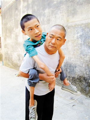 ????現今,王中民每每從工廠做完清潔回來,不管多晚,都會背著兒子出門,他背的姿勢也很獨特,兒子的兩只瘦腳被他夾在腋下,兩手抓著兒子的兩手。“我背習慣了,一點都不覺得他重。”