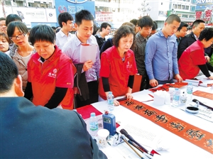近日,福田區(qū)書法家協(xié)會(huì)的書法家,在華強(qiáng)北商業(yè)街舉行了“第二屆關(guān)愛滿福田幸福進(jìn)萬(wàn)家——百名書法家進(jìn)社區(qū)送春聯(lián)活動(dòng)”,二十多名書法家當(dāng)場(chǎng)揮毫為市民群眾書寫蛇年春聯(lián),義工們協(xié)助書法家們擺放對(duì)聯(lián)、解答問題,還出動(dòng)了老年腰鼓隊(duì)助興表演,現(xiàn)場(chǎng)氣氛十分熱烈。