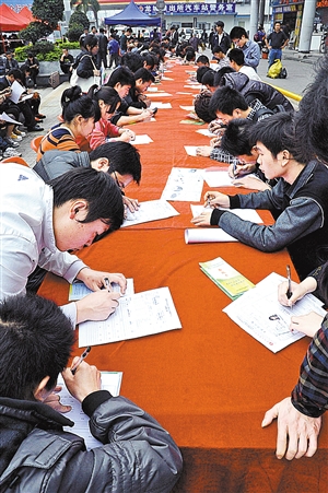 填表區(qū)擠滿了人,一些求職者在花壇邊寫簡歷。 見習記者 李立治攝