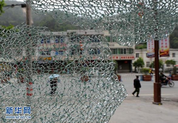4月21日在四川省雅安市寶興縣靈關(guān)鎮(zhèn)拍攝的在地震中受損的玻璃。來自民政部的消息,據(jù)四川省民政廳21日17時(shí)統(tǒng)計(jì),四川蘆山7級地震已造成208人死亡、失蹤,其中184人死亡、24人失蹤,另有11826人受傷。新華社發(fā)(薛玉斌攝)