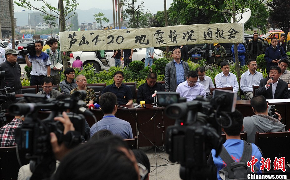 4月21日下午,四川雅安市在蘆山震災區召開抗震救災通報會,通報會上集體向“4.20”地震遇難同胞默哀,期間還兩次發生余震。截至21日地震已導致當地168人遇難,24人失蹤,10871人受傷。已發生余震1233,最大余震5.4級。圖為露天通報會現場。中新社發劉忠俊 攝