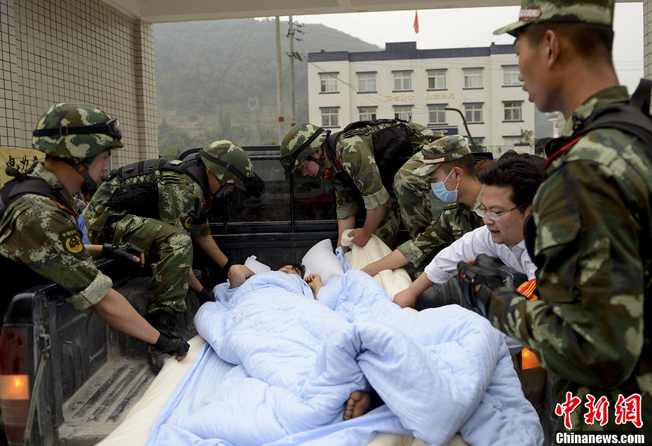 4月21日,四川省雅安市寶興縣靈關(guān)鎮(zhèn)靈關(guān)中學(xué)災(zāi)民安置點(diǎn)戰(zhàn)士轉(zhuǎn)運(yùn)女傷員。中新社發(fā) 廖攀 攝