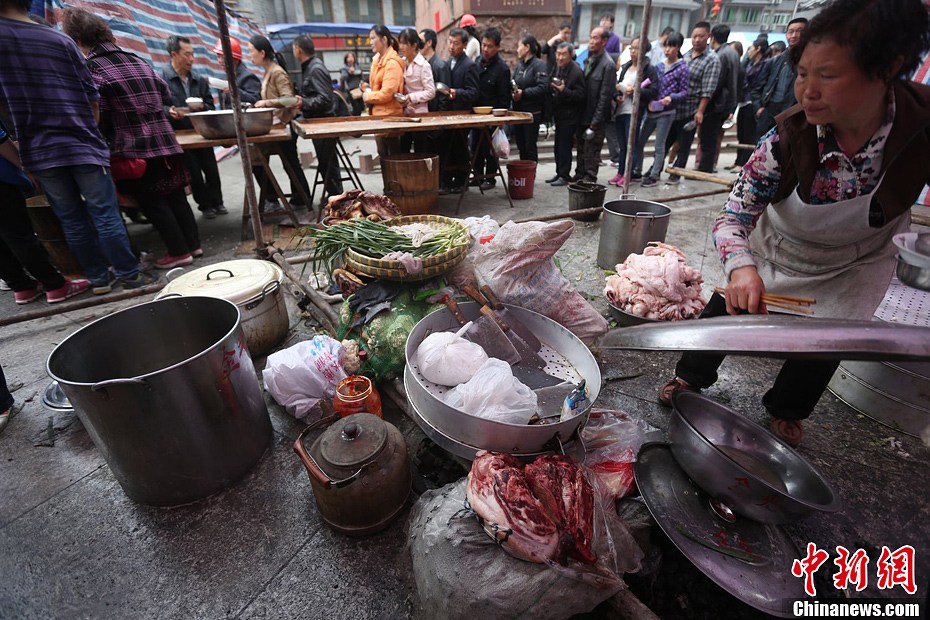 21日傍晚,寶興縣城紅軍廣場的居民安置點(diǎn),志愿者正在烹飪?yōu)拿駛兊娘埐耍麄兠刻鞛榻?000人提供食物。許云峰 攝