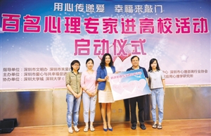 ????“百名心理專家進高校”活動是在深圳市文明辦、市關愛辦指導下,由深圳市愛心與共幸福促進中心、深圳高等教育發展辦公室、深圳晚報社、深圳市精神衛生中心、深圳市心理咨詢行業協會主辦;深圳大學城、深圳大學(團委)、深圳職業技術學院、深圳信息職業技術學院、深圳市都市陽光心理咨詢有限公司、播瑞歌應用心理學研究所協辦的一項公益心理關愛活動。旨在通過整合全城優秀心理專家資源,深入各高校,以生動活潑的形式為大學生提供心理支持。據了解,如此大規模關愛大學生心理健康的社會公益活動在深圳歷史上尚屬首次。
