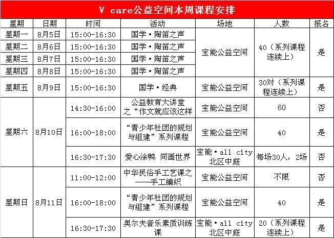 7月?20日啟動的V-care暑期公益體驗季系列活動已開展了愛心涂鴨、航天科普、手工拼豆、音樂、陶笛、DIY、舊物改造、留學生沙龍等數(shù)十場公益活動。在此基礎上,本周末開始,新增“青少年社團的規(guī)劃與組建”系列課程和以在校學生為對象的公益教育大講堂,向市民免費開放。