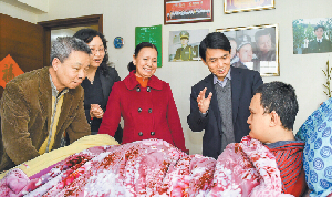 ????昨日下午,胡恒芳及市關愛辦專職副主任陳勵一行來到陳文亮家中。得知阿亮在不久前的體檢中多項生命體征均屬正常,胡恒芳非常欣慰。他來到阿亮的病房,俯身在阿亮耳邊,深情呼喚道:“阿亮,醒一醒,要去執勤了!”看到陳如豪為兒子按摩,胡恒芳也親自上陣,按壓阿亮的足部穴位,并與陳如豪探討起按摩手法。阿亮對按摩有了反應,前臂交叉在一起,眼睛睜得渾圓,見此情景,胡恒芳樂觀地說:“阿亮一定能夠醒來,等到那天,我們再坐在一起拉家常!”陳如豪則笑著答道:“這是我們共同的希望。”在陳家特意為來訪者準備的“探訪留名本”上,胡恒芳寫下了“大愛呼喚,英雄醒來”的祝福。