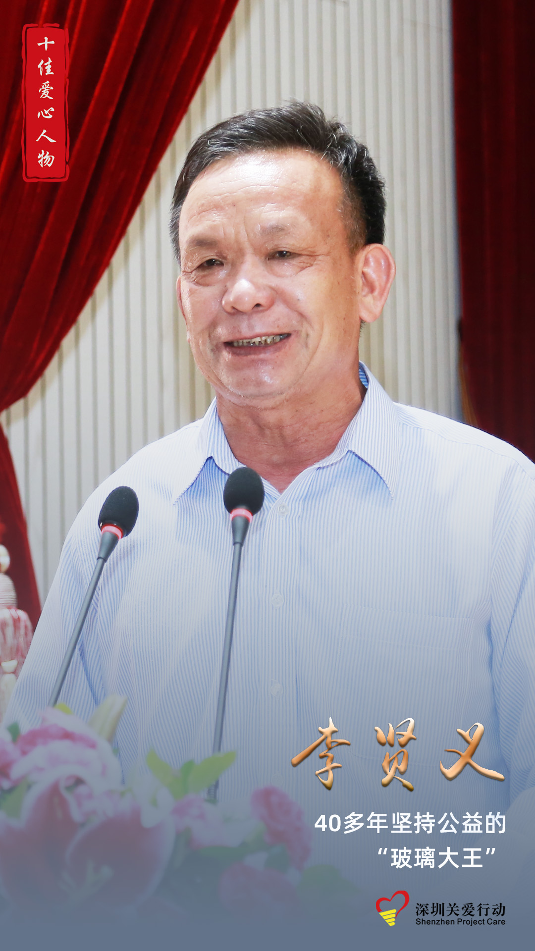 李賢義,信義集團(玻璃)有限公司董事局主席。在他的直接帶領下,信義集團40多年來累計為國家的文化交通、扶貧濟困、教育衛生、環保賑災、見義勇為等事業捐資逾10億元,是我國堅持慈善公益時間最長的企業之一。李賢義熱心教育慈善事業;積極推動公安部、中宣部對見義勇為行為的關愛和表彰;積極參與救災濟困精準扶貧等多領域公益。1993年,李賢義捐資800萬元成立了“橫崗李賢義教育基金會”,27年來獎教獎學的師生累計達34960多人次,獎教獎學金額累計已超過3930.8萬元,資助特困生1820余人。2020年為抗擊疫情累計捐贈1602.11萬元;主動減免租金;捐資支持張家港市教育事業;在龍崗區賢義外國語學校舉行頒獎典禮,為龍崗區賢義外國語學校、龍崗區科技城外國語學校、龍崗區布吉信義實驗小學獎學獎教。