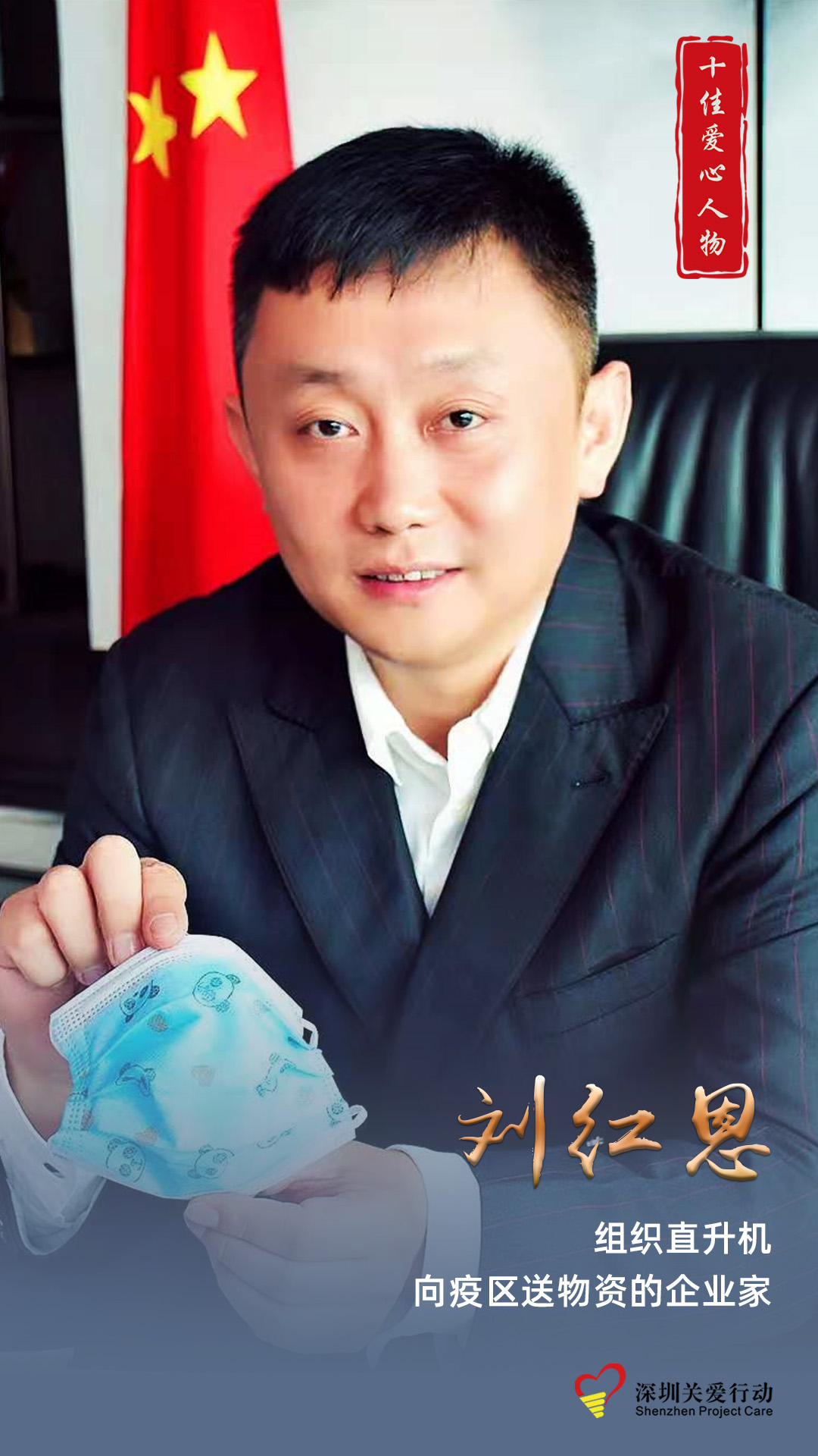 劉紅恩,深圳眾泰恩實業有限公司董事長。在2020年疫情防控期間,他取得了深圳第一張滅菌級醫用外科口罩(疫情應急產品)應急備案憑證,迅速組織生產,為一線戰“疫”人員提供保障;組織、協調、指揮公司直升飛機將疫情防控亟需的醫用口罩、防護服、呼吸機等物資運送到武漢,這是廣東省第一次派直升機執行支援全國疫情防控重點地區任務。2020年他的公司累計向政府單位、醫院、學校、公益組織、個人等捐贈100多萬個醫用外科口罩、N95口罩,以及醫療防疫機器人、額溫槍等各類防疫物資。