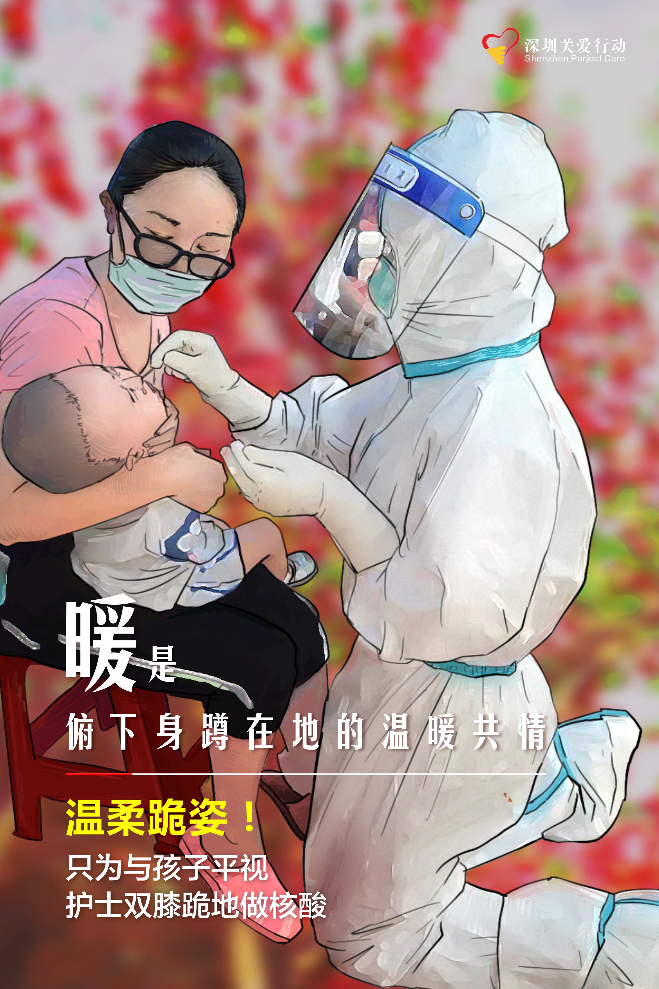 6月7日下午3點半左右,寶安區沙井街道沙二社區,深圳中西醫結合醫院的楊海萍作為晚班核酸檢測人員早早趕到現場,著手準備好各項工作后,緊張投入為社區居民進行核酸檢測的工作中。楊海萍雙膝跪地為大人懷中的嬰兒進行核酸檢測的照片在網上刷屏。楊海萍坦言,“可能是因為看到我們穿成這樣,輪到孩子們時,小孩一見到我就緊張,部分還會嚎啕大哭,為了減少他們的恐懼和痛苦,我就選擇了這樣的姿勢,只是覺得這樣可以平視孩子的眼睛,更溫柔地跟他們對話。”楊海萍說道。