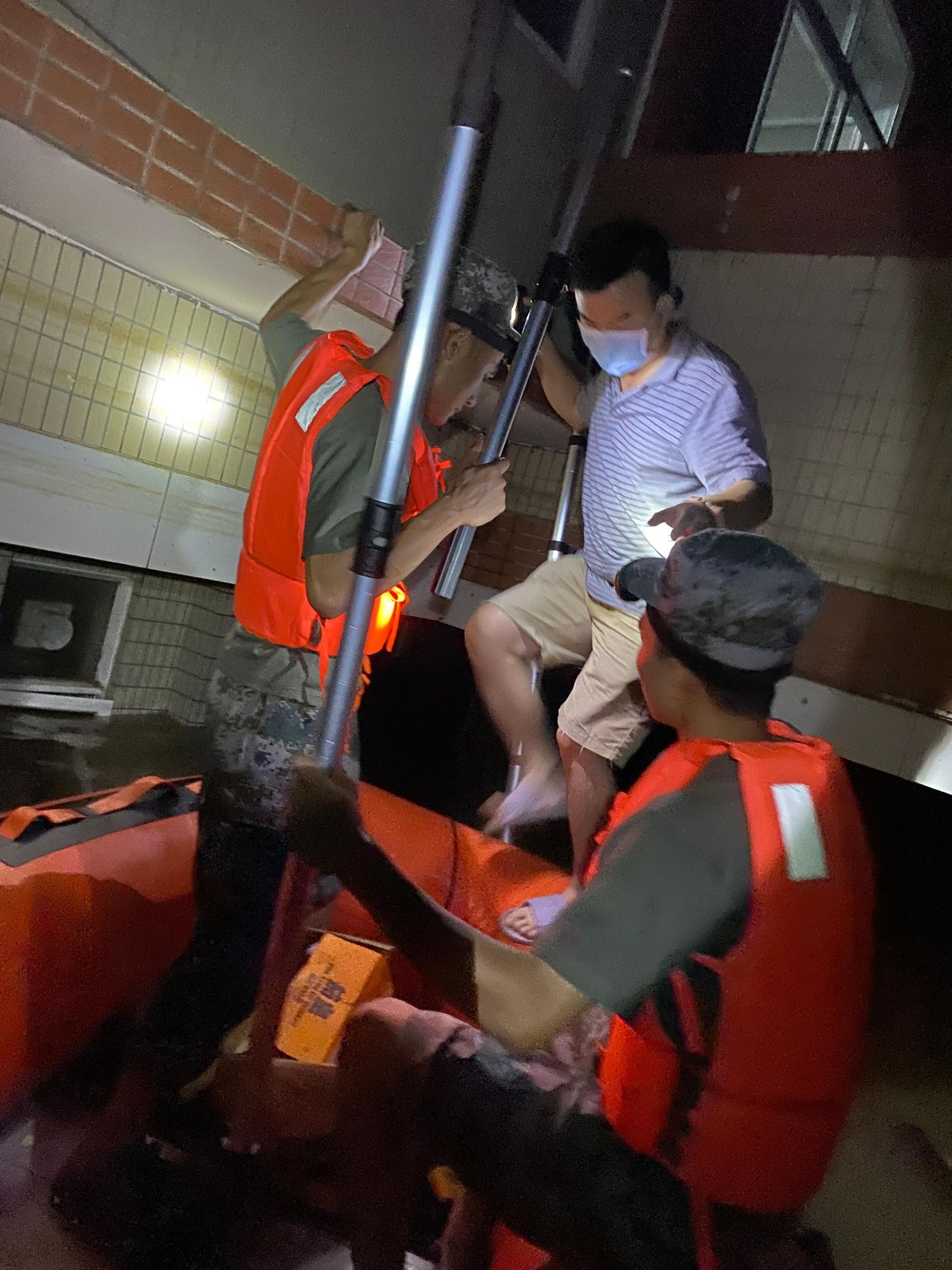 水邊鎮當時只有兩條木舟,在運輸物資和轉移群眾方面都有諸多不便。抵達當天晚上十點,童穎聰和其他救援隊員收到轉移一名內澇區域內高熱嬰兒的任務。“當時的水深有4米,水面上垃圾漂浮物較多,沖鋒舟外機渦輪反復卷進異物,導致熄火多達三十余次。”童穎聰回憶道。當他們終于趕到嬰兒家時,發現一樓已被洪水淹沒,家人帶著嬰兒躲在了二層,只有一個狹窄的窗口能夠進出。童穎聰和救援隊員們拉著窗外的空調外機,反扣空調支架,把梯子架在沖鋒舟上破窗而入,搭起人梯接力把一家人轉移出來,及時將嬰兒送往衛生院就診。