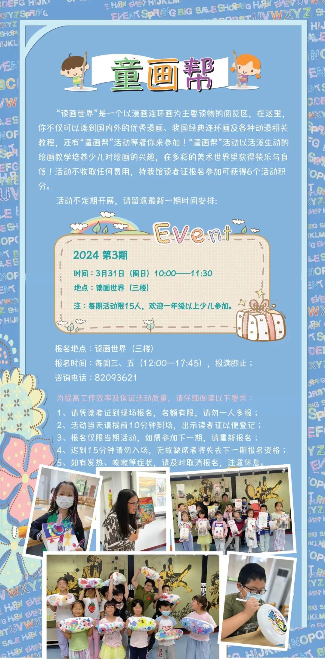 活動簡介:“童畫幫”活動以活潑生動的繪畫教學(xué)培養(yǎng)少兒對繪畫的興趣,在多彩的美術(shù)世界里獲得快樂與自信!活動不收取任何費用,持我館讀者證報名參加可獲得6個活動積分。