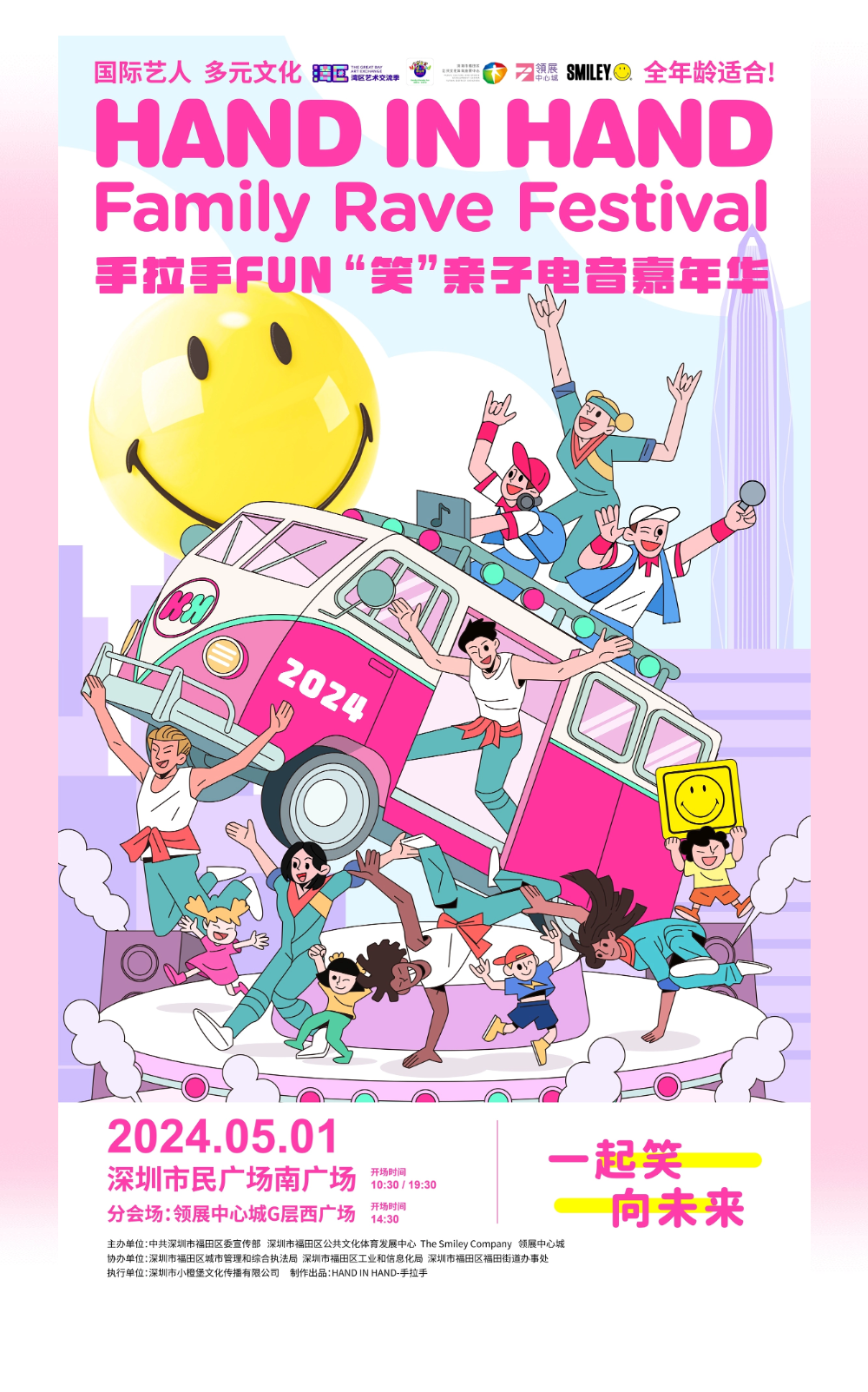 手拉手親子電音嘉年華由中共深圳市福田區委宣傳部、深圳市福田區公共文化體育發展中心、The Smiley Company及領展中心城主辦,深圳市福田區城市管理和綜合執法局、深圳市福田區工業和信息化局、深圳市福田街道辦事處協辦,深圳市小橙堡文化傳播有限公司為執行單位。屆時將作為開幕演出打響歡樂五月第一彈!