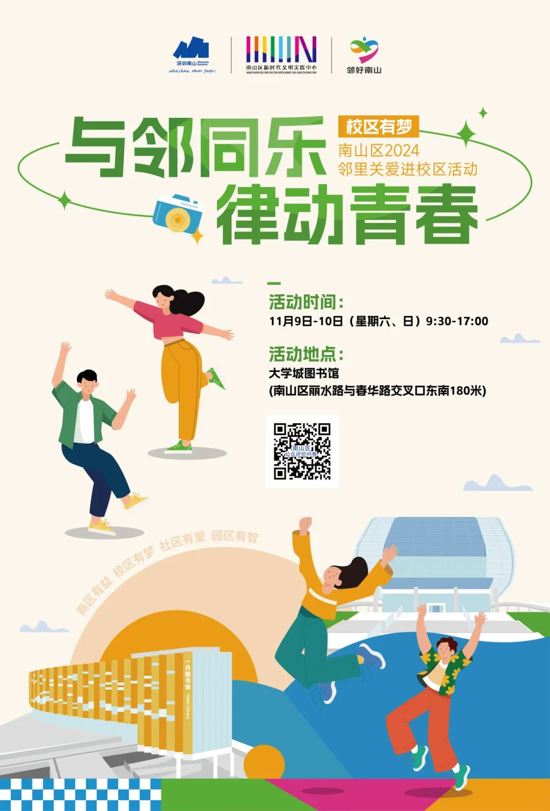 活動簡介:一個機會,與校區(qū)鄰里相熟悉,一次歡聚,與青年同行共歡樂。鄰好南山,如約而至。以鄰里集、鄰里FUN、鄰里TALK、鄰里匯四大板塊設(shè)置青年共創(chuàng)市集、主題沙龍、社團(tuán)才藝展演、校區(qū)鄰里資源服務(wù)等系列活動,邀好玩、有趣、青年才俊的你與我們共塑校區(qū)鄰里節(jié)。