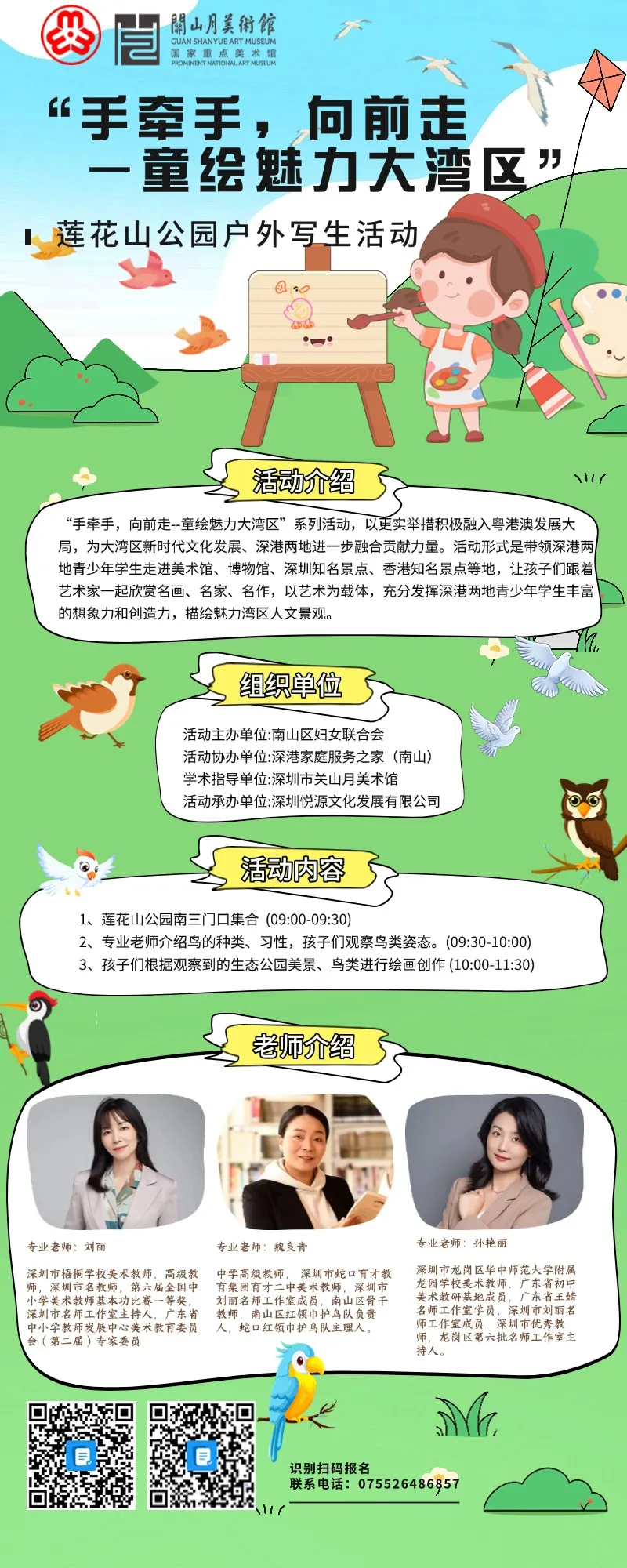 活動簡介:每年十一二月深圳都會有一道靚麗的風(fēng)景線,遷徙來南方過冬的“候鳥”會陸續(xù)出現(xiàn)。南山區(qū)婦聯(lián)“手牽手,向前走 —— 童繪魅力大灣區(qū)” 活動誠邀深港兩地青少年兒童來到蓮花山公園觀鳥臺,開啟一場精彩的戶外寫生畫鳥之旅,一起來蓮花山觀鳥、寫生吧!