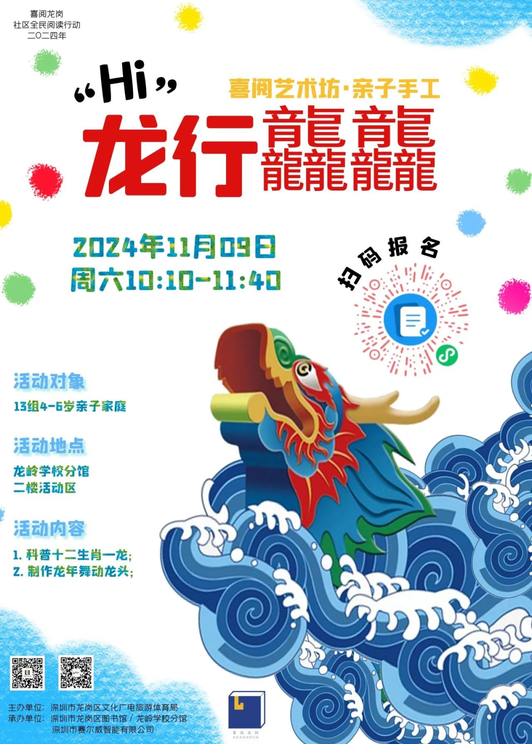 活動簡介:龍,在我國扮演著神秘的神話傳說角色。為了讓親子家庭們了解十二生肖——龍,深圳市龍崗區(qū)圖書館龍嶺學(xué)校分館將于2024年11月09日周六10:10-11:40在圖書館二樓活動區(qū)舉辦喜閱藝術(shù)坊“龍行龘龘”公益活動,讓我們一起科普龍的身形構(gòu)造,最后攜手制作龍年舞動龍頭,為今年龍年增添不一樣的趣味吧~