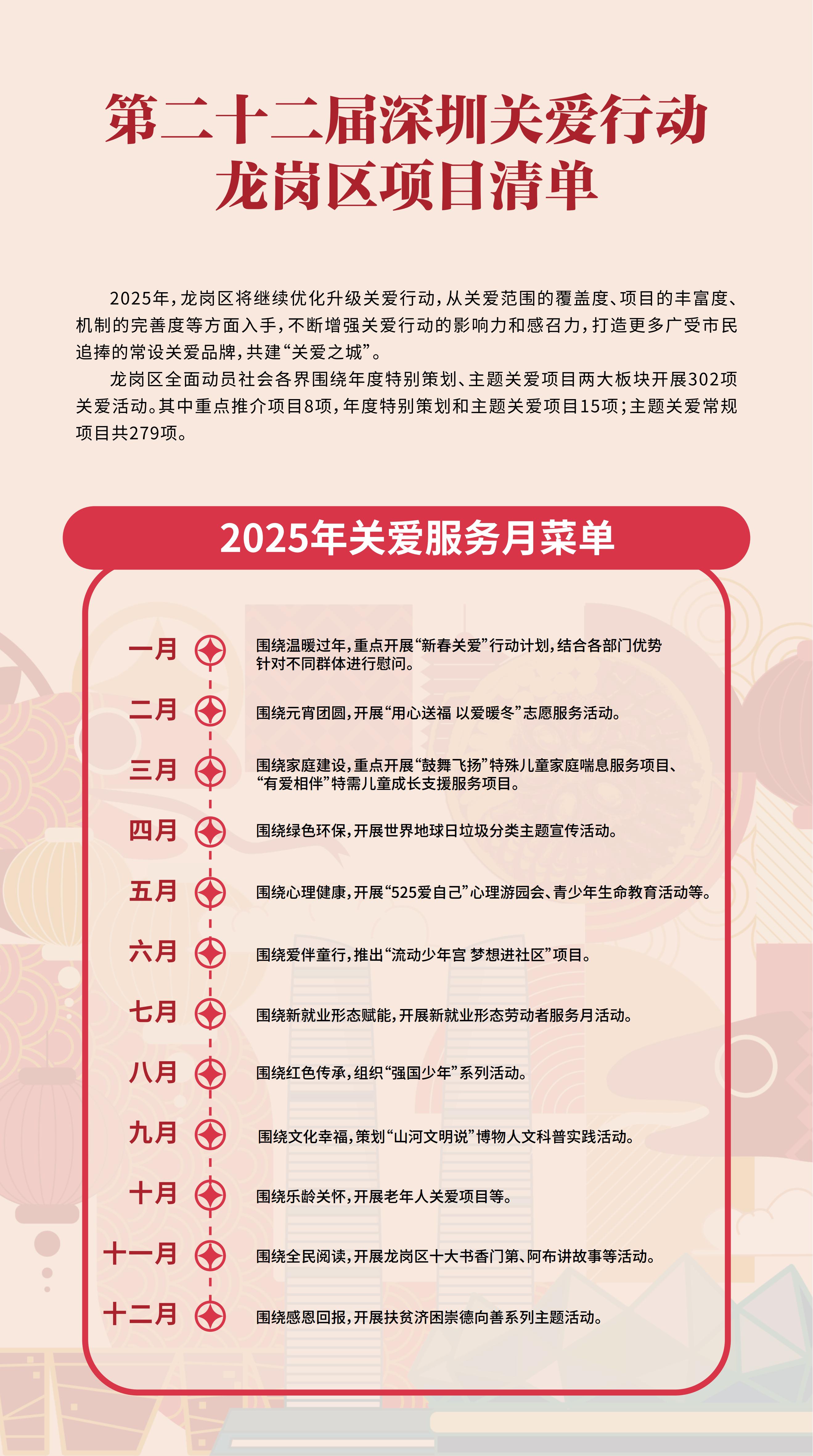“新春大盆菜 溫暖送到家”2025年龍崗區關愛行動啟動活動為今年的關愛行動奏響了序曲。接下來,龍崗區在新的一年里,將以更豐富多元的形式、更扎實有力的舉措,全力推進關愛活動清單落地開花,用實際行動詮釋了“情暖鵬城 愛在龍崗”的深刻內涵,共同繪制一幅又一幅溫馨感人的愛心畫卷。